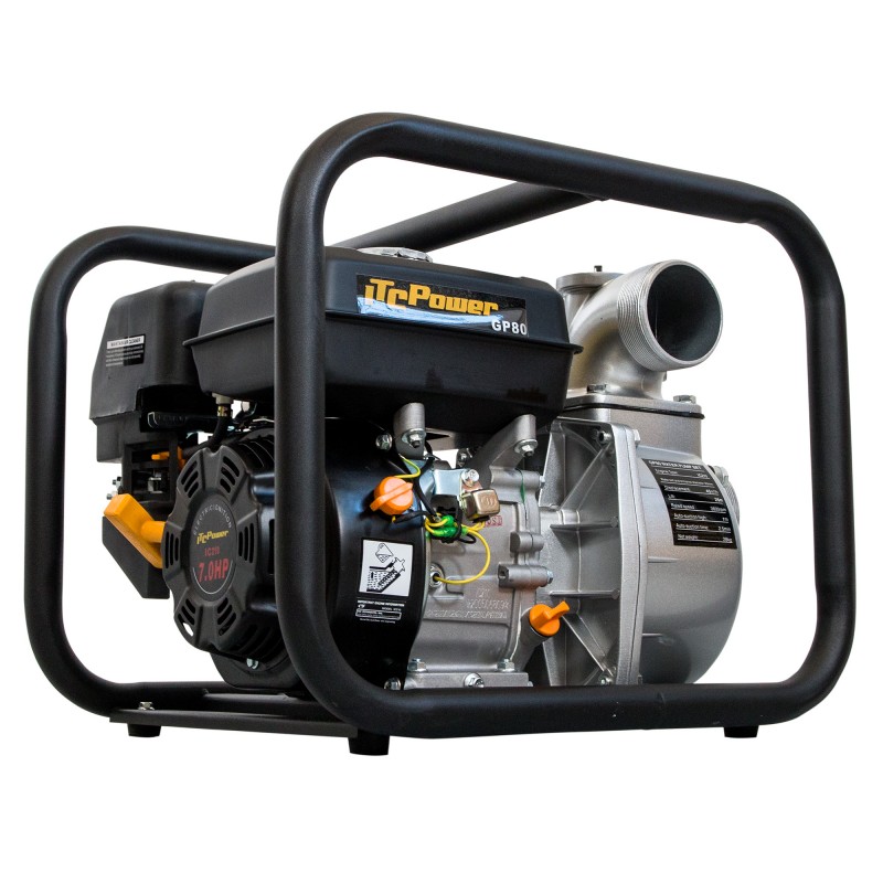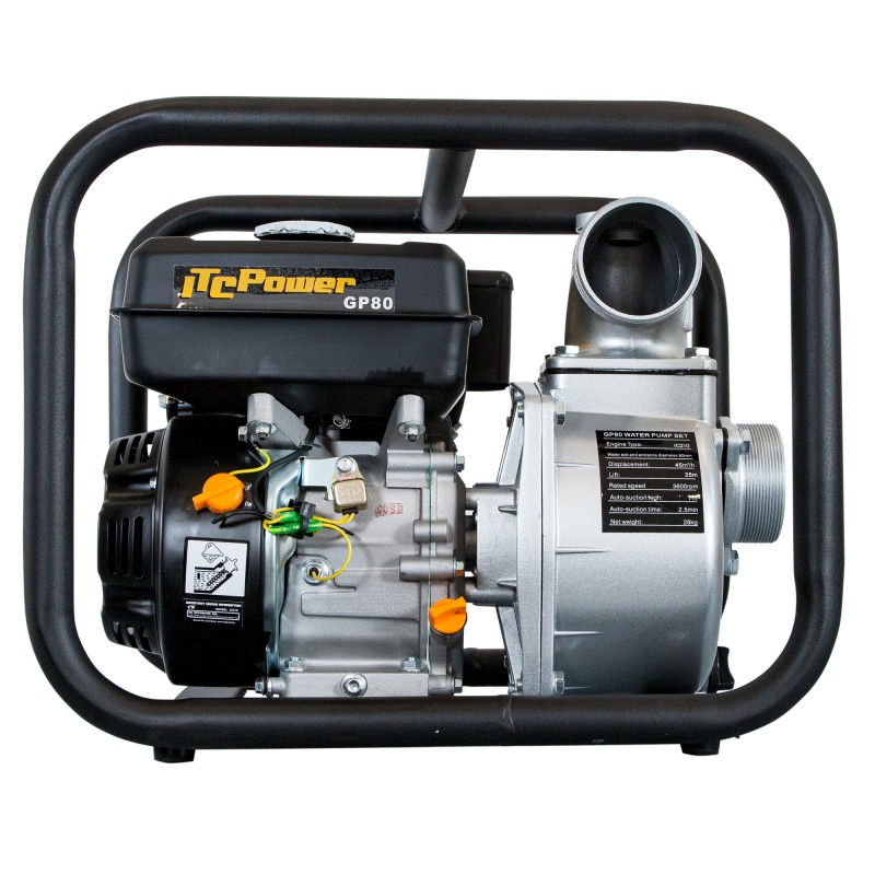 La ITCPower GP80 es una motobomba de gasolina de alto rendimiento, diseñada para el bombeo eficiente de aguas limpias en aplicaciones agrícolas, de riego y drenaje. Equipada con un motor IC210 de 4 tiempos y 198 cc, ofrece una potencia de 6,5 HP, permitiendo alcanzar una altura máxima de elevación de 30 metros y un caudal máximo de 60.000 L/h (1.000 L/min). Su estructura robusta y compacta, junto con un peso de 28 kg, facilita su transporte y manejo en diferentes entornos. Además, cuenta con un depósito de combustible de 3,6 litros, asegurando una autonomía adecuada para trabajos prolongados.